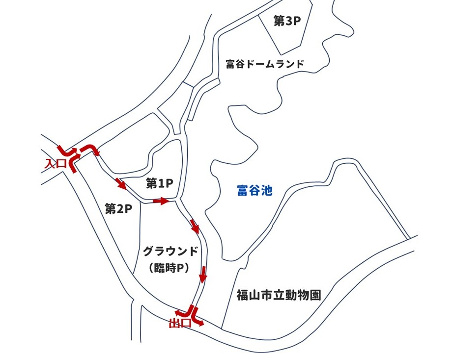 混雑緩和を目的として、第11回福山市立動物園まつりの駐車場において、下図のとおり入口を変更し、通常の入口を出口とする一方通行でのご案内をさせていただきます。