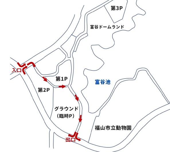 当園では混雑緩和を目的として、ゴールデンウィーク期間の駐車場において、下図のとおり一方通行でのご案内をさせていただきます。